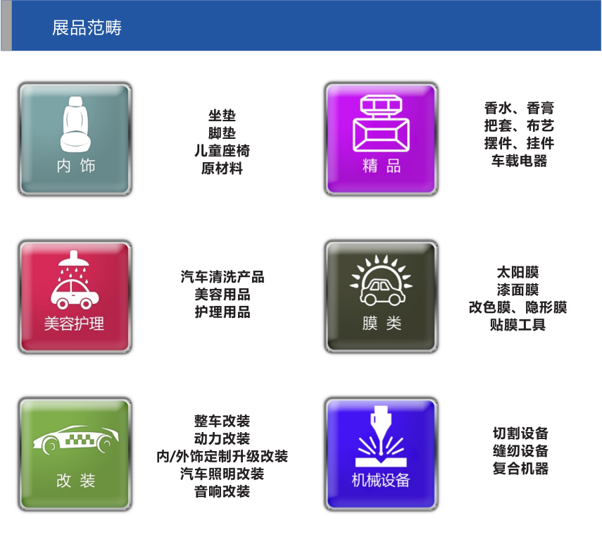 以汽车膜、改装、照明、洗美护、连锁加盟、内饰、精品等汽车后市场品类为依托,引进国内千余家生产厂商,通过地域辐射和渠道下沉,为逾10万来自全国各地的批发商、经销商、零售门店、电商提供行业最新趋势与市场咨询,实现渠道的扁平化。
